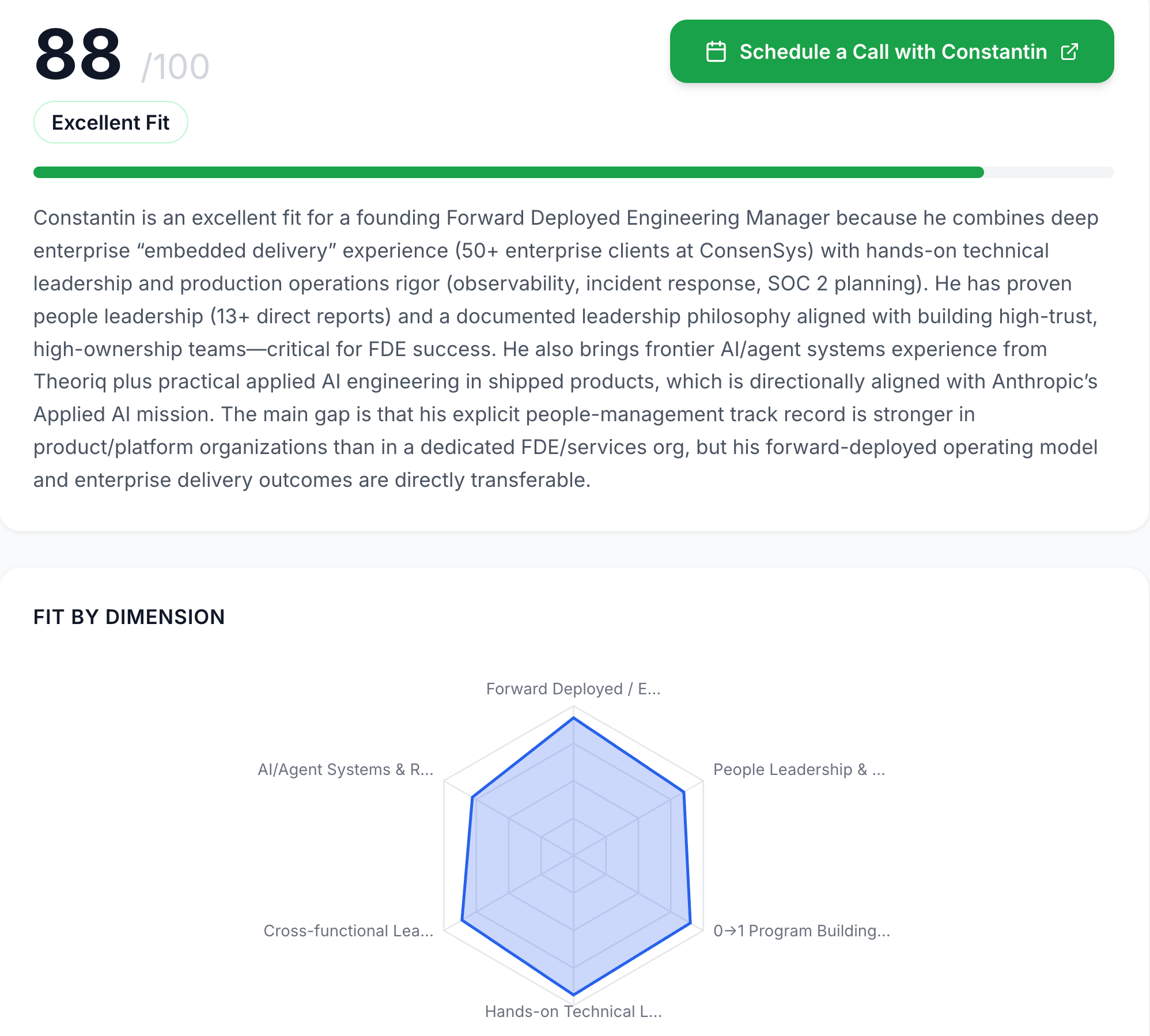 It is an AI-powered fit analysis tool. A recruiter pastes any job description and within seconds receives a scored breakdown of how well my background maps to the role. Not a keyword match, not a summary. A reasoned analysis grounded in 23 years of documented project work (~40-45K tokens), with scores across 7 dimensions and specific proof points pulled from real case studies.
