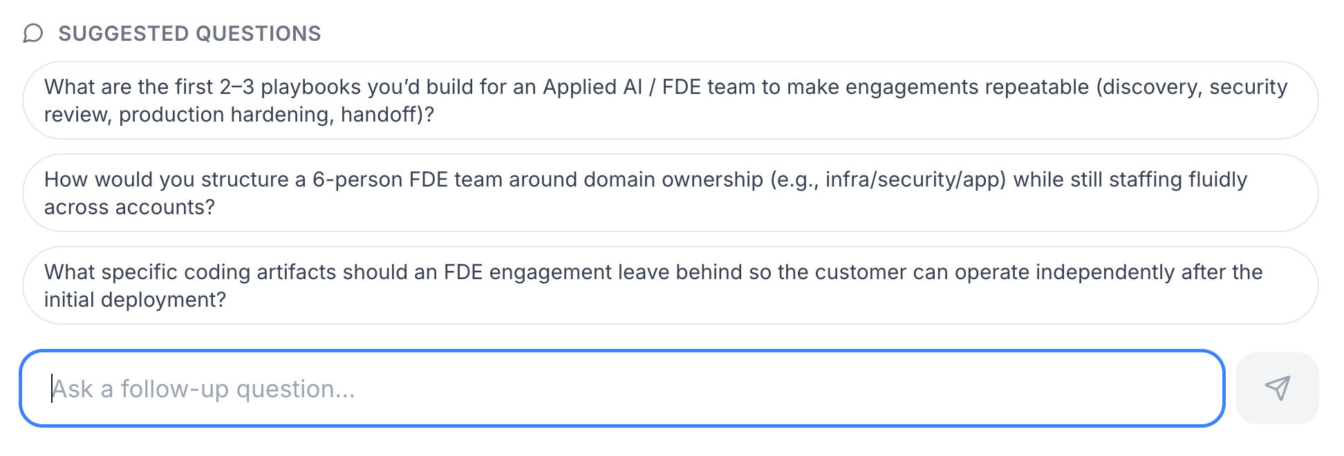 The chat interface caps sessions at 20 questions with a warning at 15. This is a product decision, not a technical one. A cap creates light urgency and gives the session a natural end point. The warning at 15 functions as a soft call to action. The intent is for the session limit to push a qualified recruiter toward booking a real call before they run out of questions. That is the outcome the whole tool is built toward.