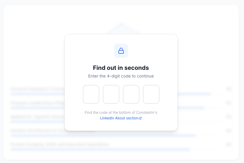 Validated server-side on every API route via a custom request header, because client state can be spoofed. A server-side header check cannot be bypassed without knowing the code. The gate is not a security system. It filters random internet traffic and signals to recruiters that they need to engage with the LinkedIn profile to access the tool. This is not sophisticated, but it is a reasonable bar for this experiment.