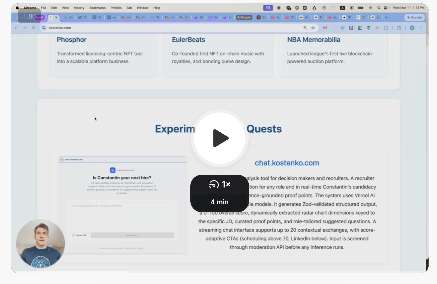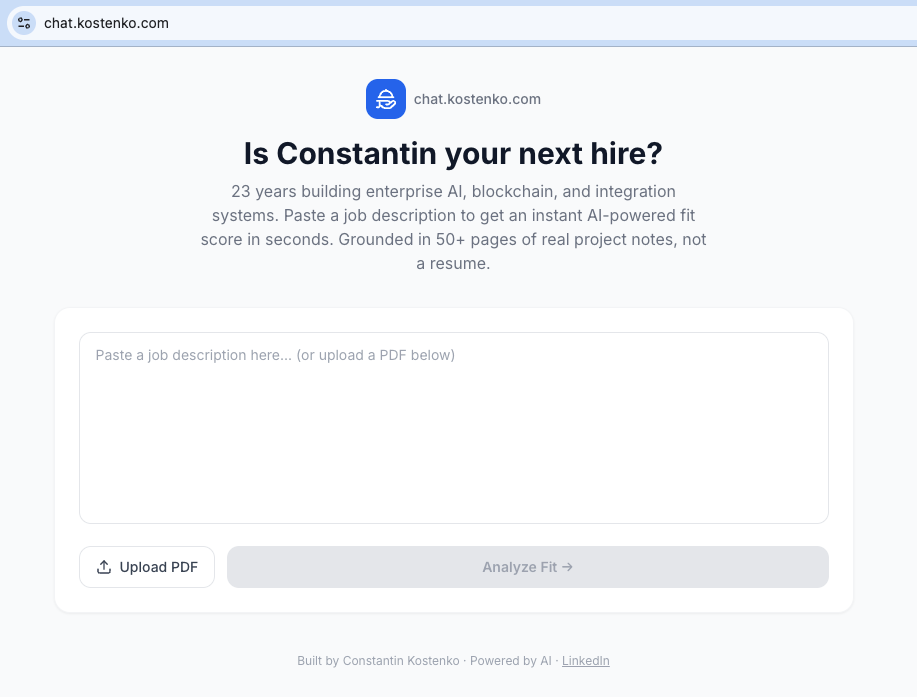 So I built chat.kostenko.com. It's protected, so if you're a decision maker or a recruiter ping me. Otherwise you can watch a recording to experience this.